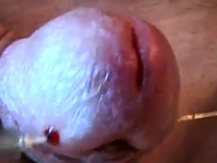 Horny tranny girl sucks a thick dildo and rubs it on her